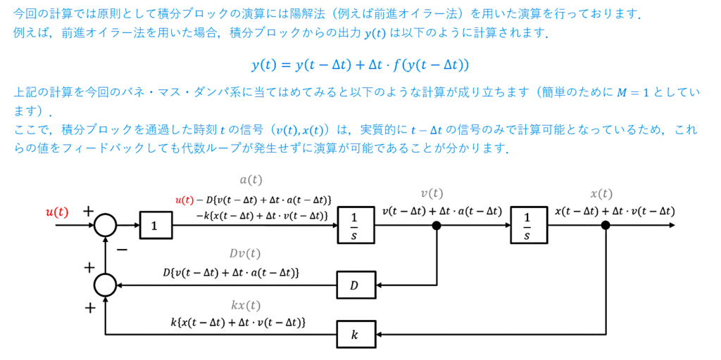おっしゃるように,厳密には伝達関数への入力はU(s),Y(s)のようなラプラス変換された信号形式で挿入されなければなりません。しかしながら,Simulinkの場合はすべての信号が時間関数(例えばu(t),y(t))として扱われています。したがって,Simulink内部ではsを微分演算子(1/sは積分演算子)として取り扱っているにすぎず,実際には伝達関数に対応する微分方程式を解いていると考えられます(下図)。したがって,ラプラス変換自体を純粋に扱うことはできません。