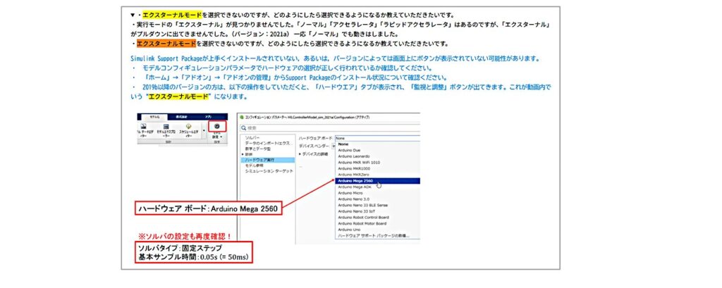 R2024aを使用してますが、「エクスターナル」に変更する操作が出来ません。また4-19④に記載の実行をするとエラーになります。おそらくですがR2016からのUI変更があったかと思われます。ハードウェアタブからモードをボード上で実行を選択後に監視と調整を実行することで解決できた認識ですが、念のためご回答頂けると幸いです。